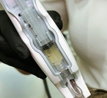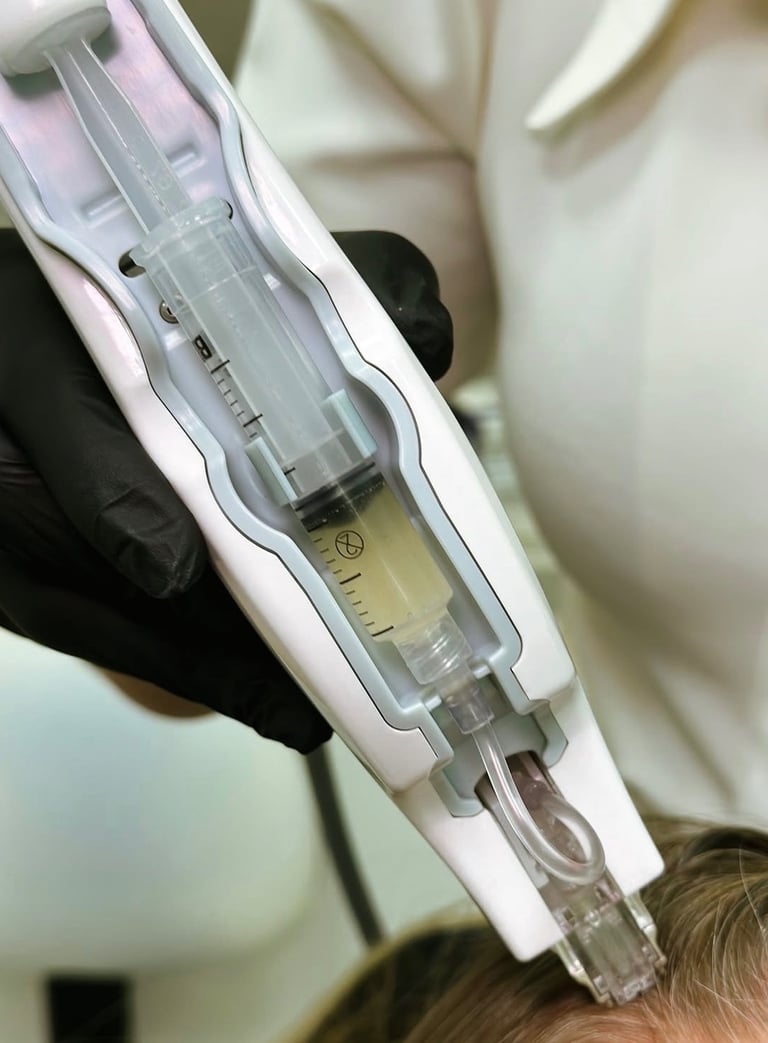 Deze verfijnde, state-of-the-art techniek stelt ons in staat om de werkstoffen exact op de juiste diepte en in de juiste dosering toe te dienen, met een gelijkmatige verdeling over de behandelde zones op de hoofdhuid.